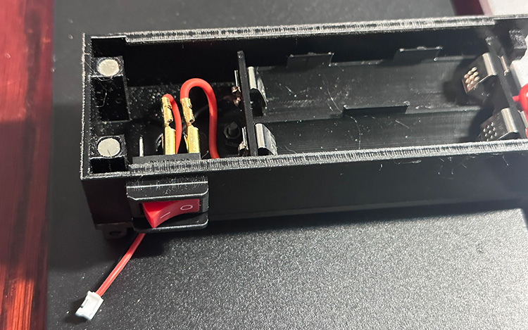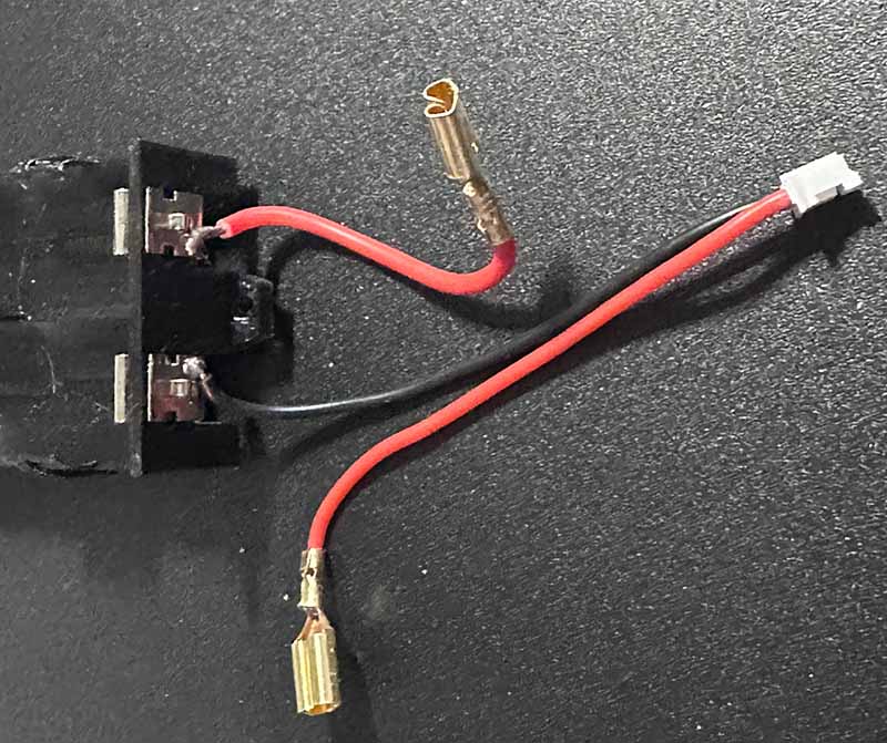 Next take the other 2 battery buckles, on one solder a short piece of wire with a spade connector on the other end. This will go from the positive battery terminal to the On/Off Switch. On the last battery buckle, solder the negative side of a connector cable. Make sure it’s the opposite gender of the connectors on the Wye you created above. Finally, solder another spade connector to the positive wire from the connector. Attach the battery buckles to the battery holder. You should end up with something like the below image: